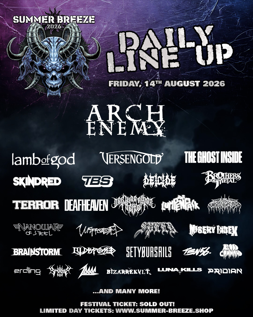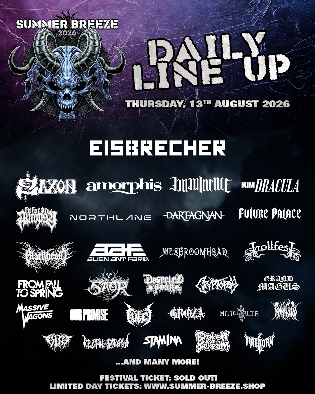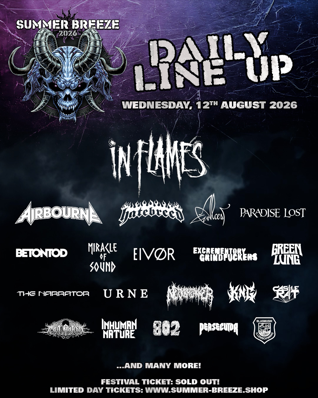 Dass das SUMMER BREEZE Open Air längst ausverkauft ist, kommt nicht überraschend. Über die Jahre hat sich das Festival einen festen Platz erarbeitet. Nicht nur wegen des Line-ups, sondern wegen des Gesamtpakets. Und genau das bleibt auch 2026 bestehen: vier Tage, die nicht über einzelne Highlights funktionieren, sondern über das Zusammenspiel aus Bands, Gelände und Publikum. Wer ein Ticket hat, weiß in der Regel, warum. Tagestickets könnt ihr für die verschiedenen Tage noch im Shop bekommen. Schaut einfach mal auf der Homepage vorbei, da werden eure eventuell noch offenen Fragen ganz sicher beantwortet: https://www.summer-breeze.de/de/