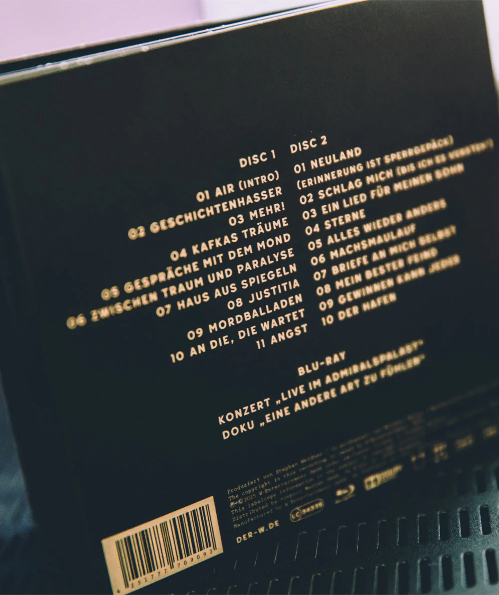 Beginn der Blu-ray mit tosendem Applaus und einsetzender Violine und Cello. Der Saal ist atmosphärisch perfekt beleuchtet und das Bühnenbild ist auf ein ideales Minimum reduziert – schlicht, aber äußerst ausdrucksstark. Der W veröffentlicht zu seiner vergangenen Akustiktour, die über 10.000 Menschen begeisterte, eine Live-Platte inklusive Dokumentation und Live-Konzert auf Blu-ray am 28.11.25. Was dieses Stück Geschichte taugt und was euch erwartet, erfahrt ihr jetzt.